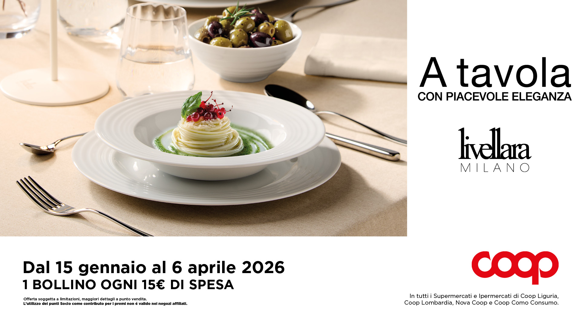 Dal 15 gennaio al 6 aprile 2026 in tutti i punti vendita di Coop Liguria ricevi un bollino ogni 15€ di spesa. Aggiungendo un piccolo contributo o utilizzando i punti della tua Carta SocioCoop, potrai ritirare uno dei bellissimi prodotti Livellara Milano: a tavola con piacevole eleganza.